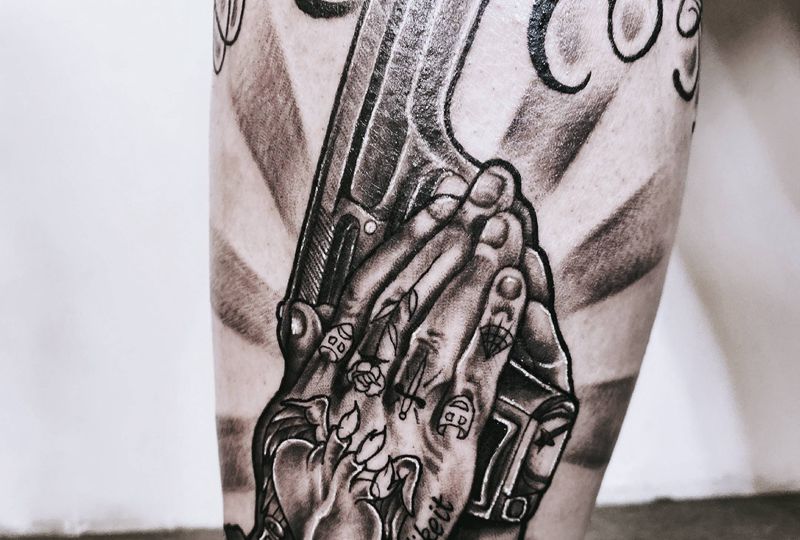 当前位置: 首页 >广东省广州市纹身店-广州匿名者刺青纹身图案>奇卡诺花体字祈祷手纹身图片_腿部花体字欧美写实花体字祈祷手奇卡诺纹身图案