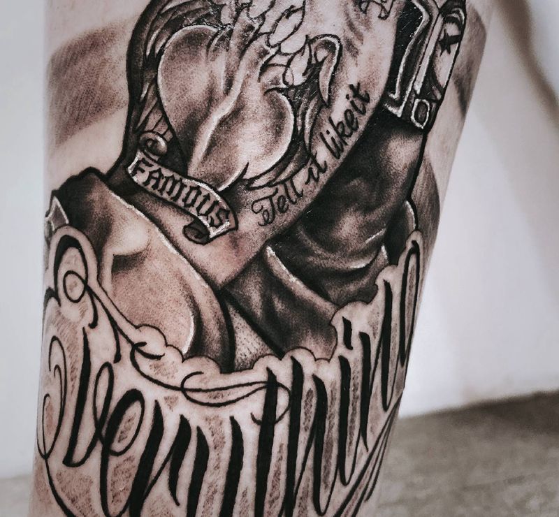 当前位置: 首页 >广东省广州市纹身店-广州匿名者刺青纹身图案>奇卡诺花体字祈祷手纹身图片_腿部花体字欧美写实花体字祈祷手奇卡诺纹身图案
