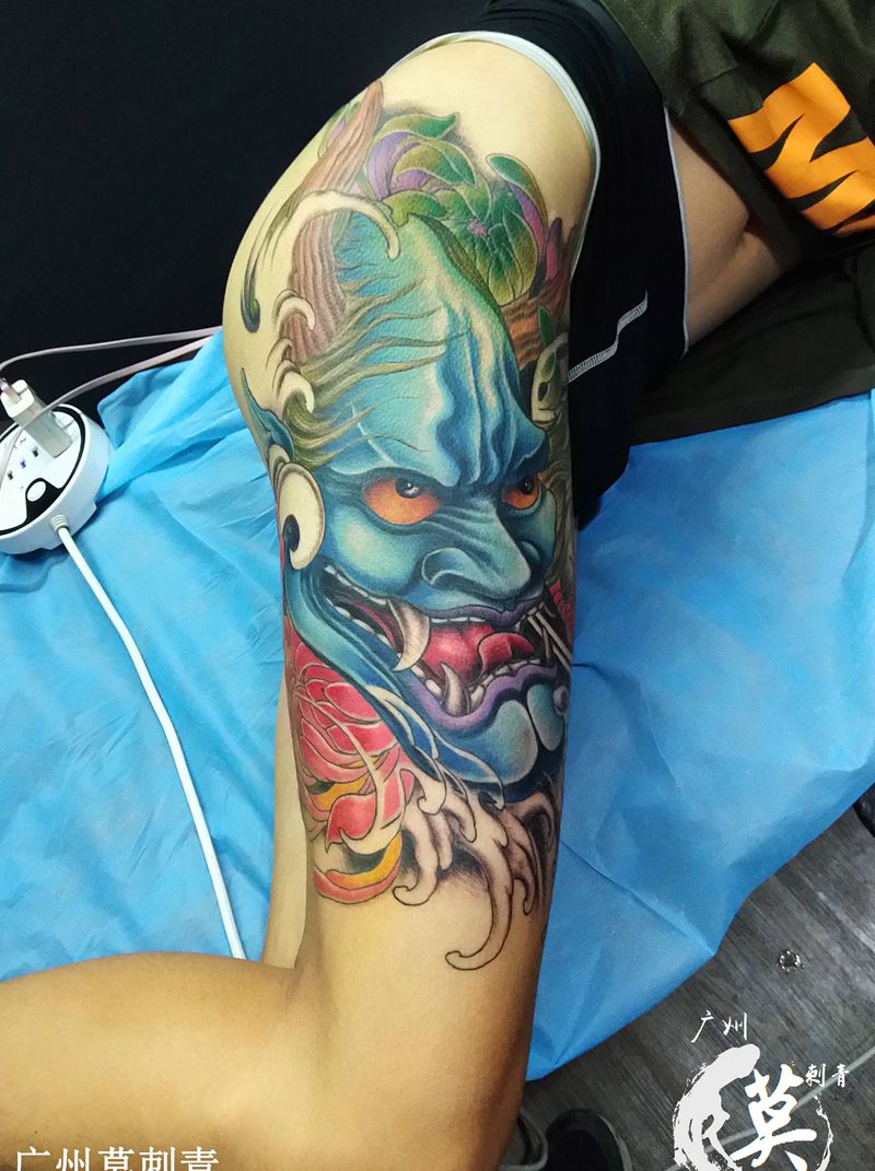 当前位置: 首页 >广东省广州市纹身店-广州莫刺青纹身图案>新传统彩色般若纹身图片_腿部脚部新传统老传统般若纹身图案