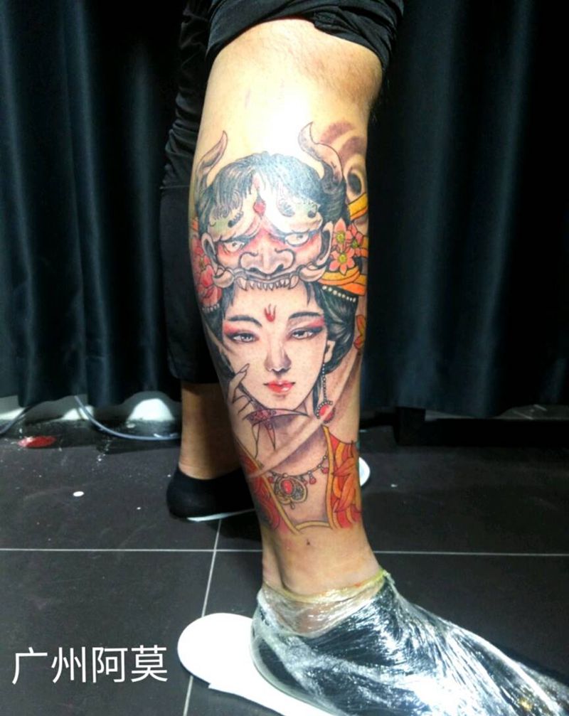 当前位置: 首页 >广东省广州市纹身店-广州莫刺青纹身图案>艺妓般若纹身图片_腿部脚部传统肖像写实人物鬼神成品纹身图案