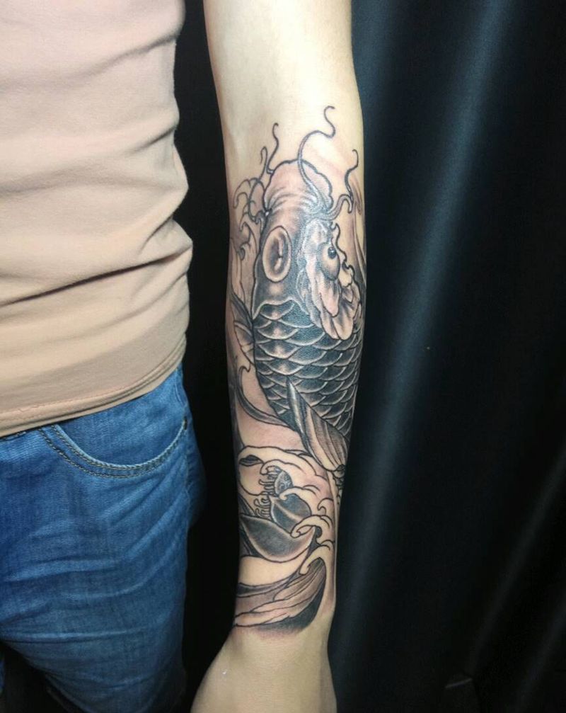 当前位置: 首页 >广东省广州市纹身店-广州莫刺青纹身图案>鲤鱼荷花包小臂纹身图片_臀部手臂手部传统清新动物植物成品手稿纹身图案