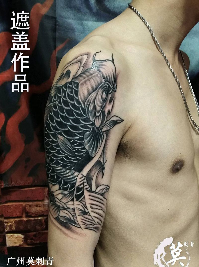 黑灰鲤鱼遮盖纹身图片_手臂手部欧美传统习俗清新写实国画成品手稿纹身图案
