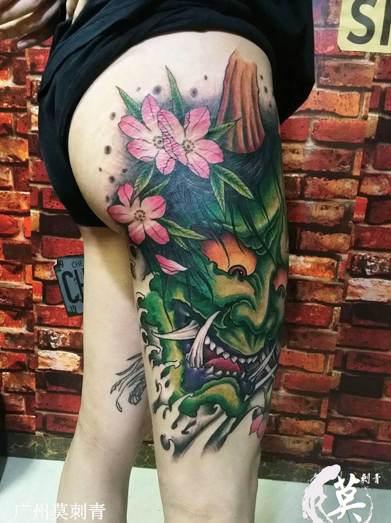 当前位置: 首页 >广东省广州市纹身店-广州莫刺青纹身图案>大腿般若纹身图片_腿部脚部新传统老传统般若彩色传统纹身图案