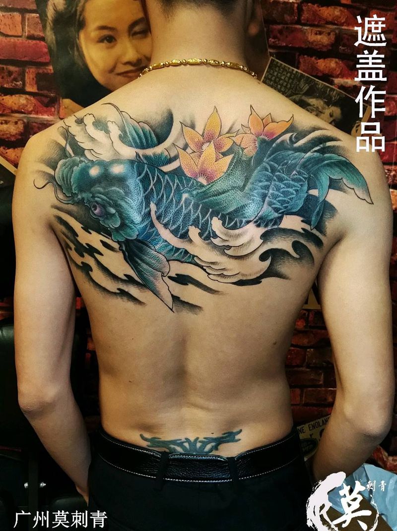 后背鲤鱼遮盖纹身图片_背部老传统新传统鲤鱼遮盖纹身图案