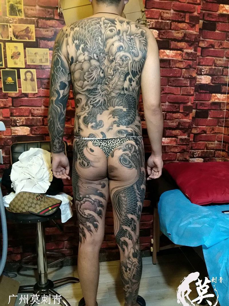 当前位置: 首页 >广东省广州市纹身店-广州莫刺青纹身图案>大龙作品纹身图片_背部脚部新传统老传统大龙满背通体纹身图案