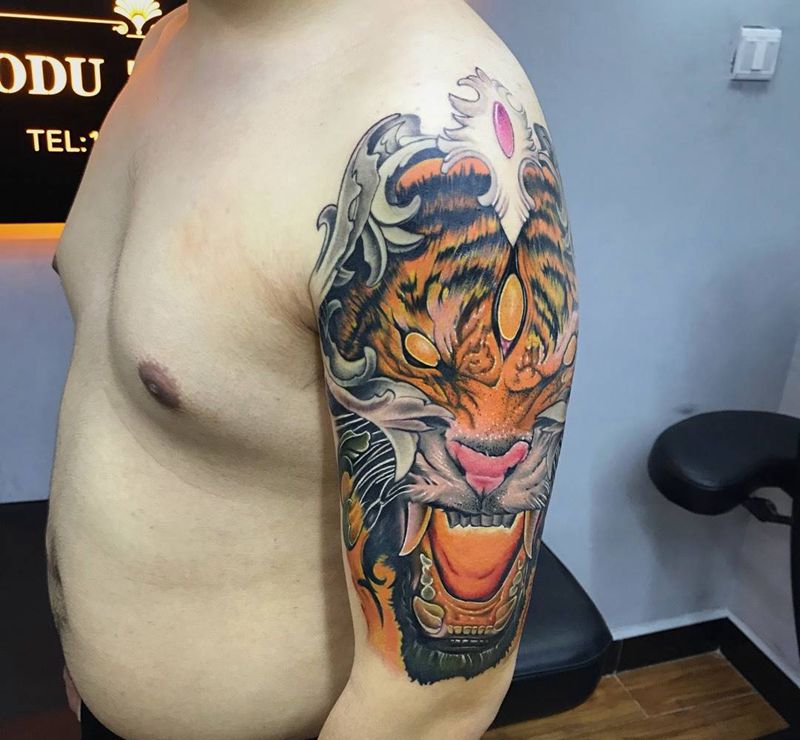 当前位置: 首页 >广东省广州市纹身店-墨都刺青纹身图案>大老虎纹身图片_手臂手部欧美写实New School纹身图案