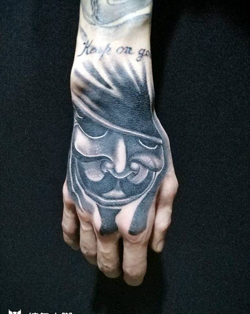 当前位置: 首页 >广东省广州市纹身店-刺客纹身纹身图案>V字仇杀脸谱纹身图片