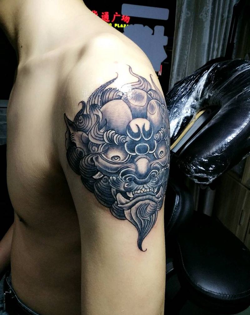 当前位置: 首页 >广东省广州市纹身店-刺客纹身纹身图案>唐狮掩盖作品纹身图片