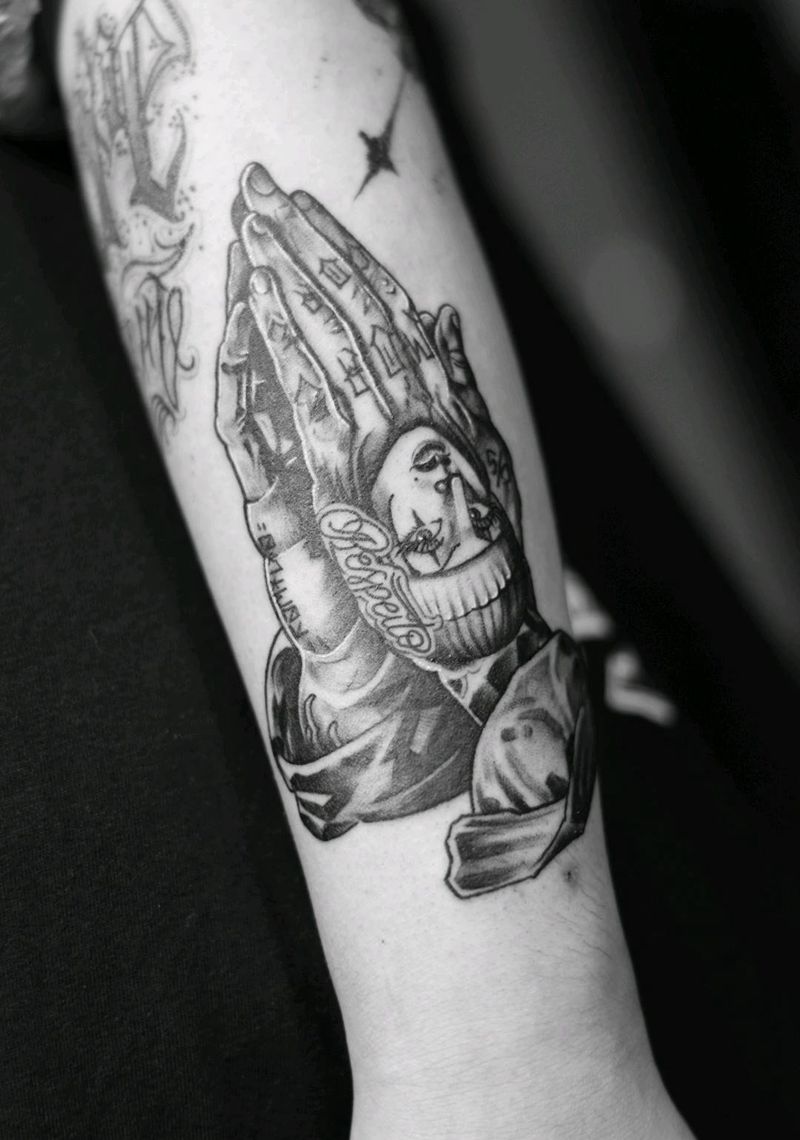 暗黑祈祷之手纹身图片_手部花体字欧美写实手欧美纹身图案