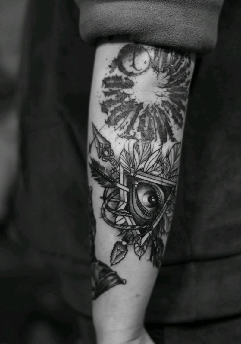 暗黑上帝之眼纹身图片_手部欧美写实眼睛叶子矛纹身图案