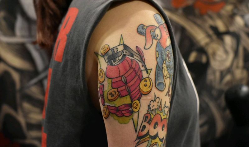 当前位置: 首页 >广东省广州市纹身店-ReAL-TATTOO(番禺店)纹身图案>骚粉手雷纹身图片_手臂New SchoolOld School手雷武器炸弹纹身图案