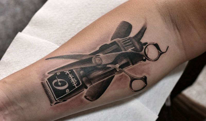推子剪刀梳子纹身图片_手部欧美写实发型师推子剪刀纹身图案