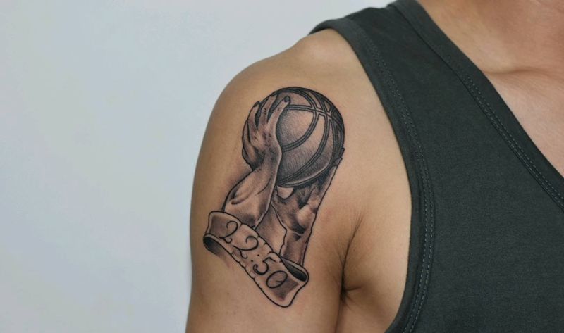 投球手纹身图片_手臂欧美写实篮球纹身图案
