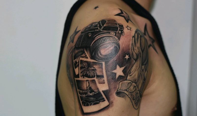 单反相机及背景添加纹身图片_肩部欧美写实相机五角星篮球纹身图案