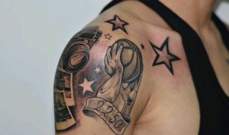 单反相机及背景添加纹身图片_肩部欧美写实相机五角星篮球纹身图案