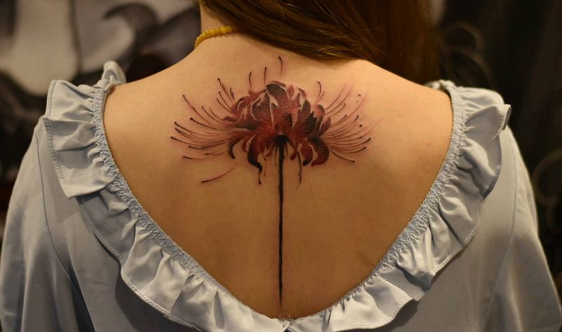 彼岸花纹身图片_背部水墨水彩花小清新纹身图案