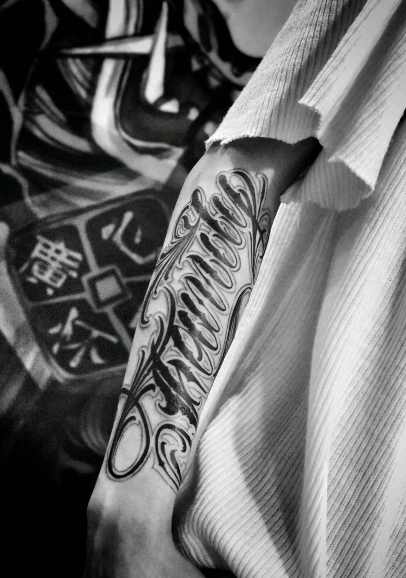 当前位置: 首页 >广东省广州市纹身店-ReAL-TATTOO(番禺店)纹身图案>family花体纹身图片_手臂花体字纹身图案