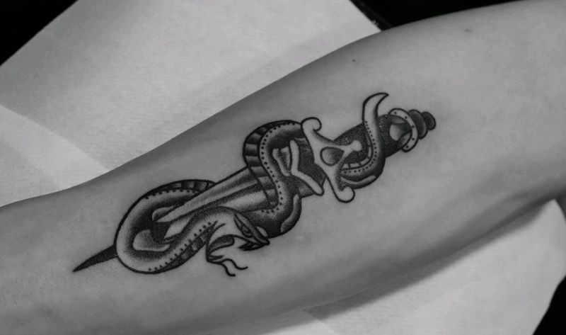 黑灰old school纹身图片_手部Old School蛇匕首纹身图案