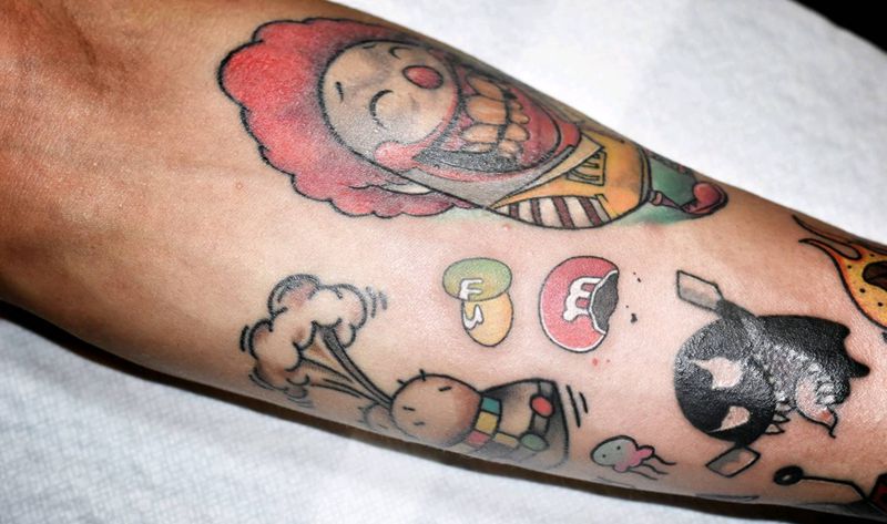 • T包小腿吹火男+阿多福纹身图片_腿部老传统新传统吹火男阿