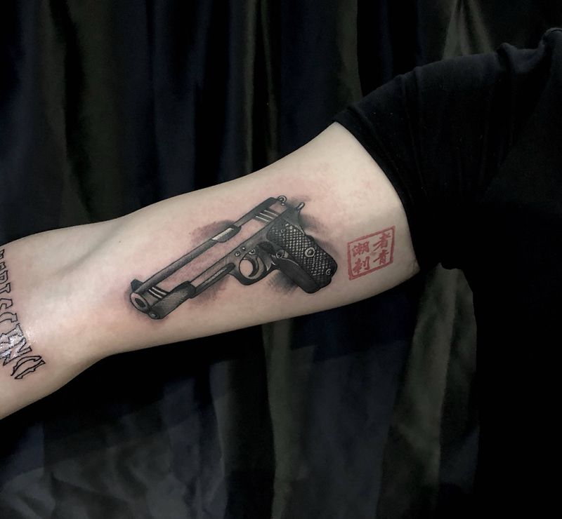 当前位置: 首页 >广东省广州市纹身店-丹刺青工作室纹身图案>手枪纹身图片_手臂欧美写实纹身图案