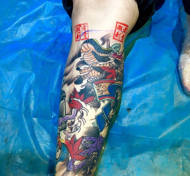 • T网红王老大花腿龙纹身图片_腿部新传统纹身图案