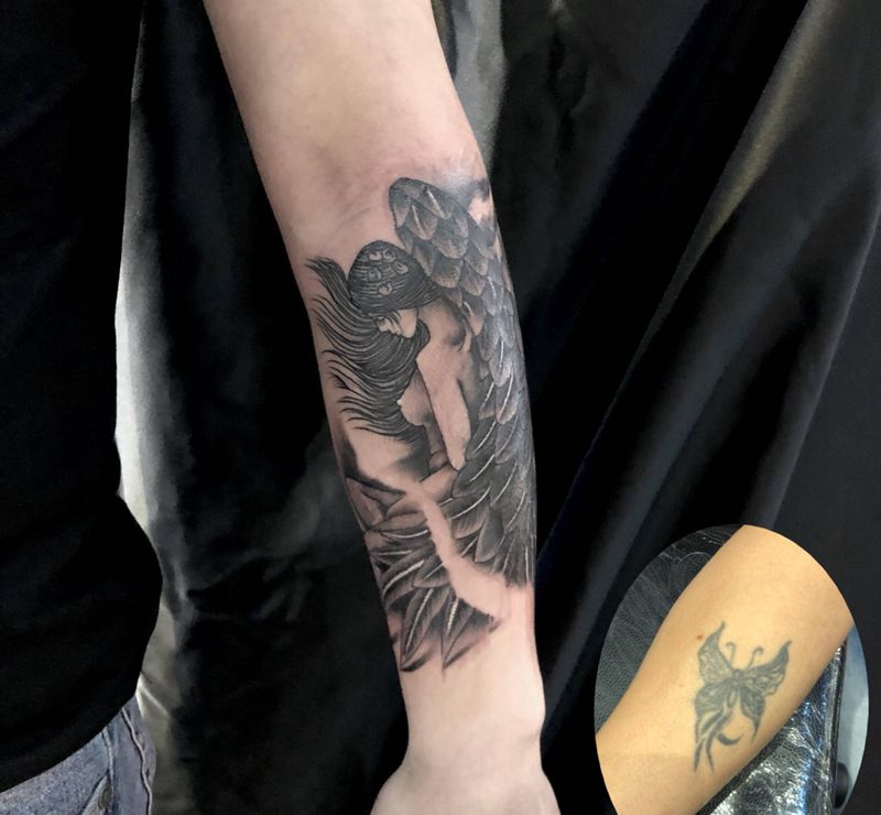 当前位置: 首页 >广东省广州市纹身店-丹刺青工作室纹身图案>天使 遮盖纹身图片_手臂欧美写实纹身图案