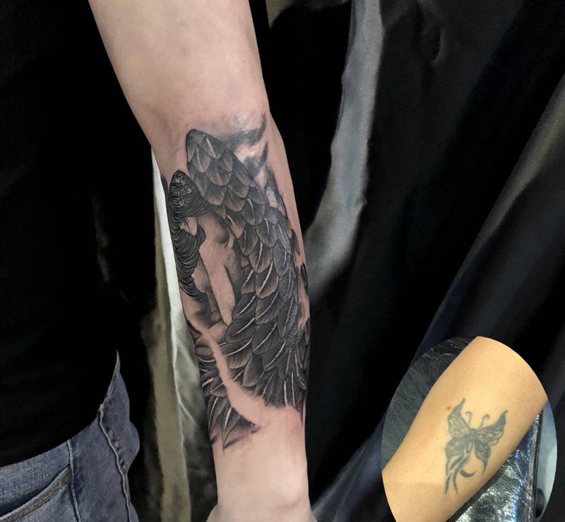 当前位置: 首页 >广东省广州市纹身店-丹刺青工作室纹身图案>天使 遮盖纹身图片_手臂欧美写实纹身图案