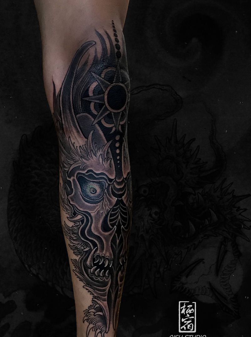 • T网红王老大花腿龙纹身图片_腿部新传统纹身图案