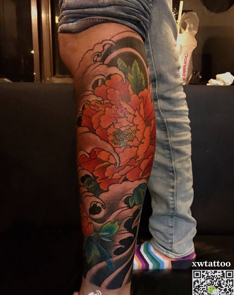 原创 传统 牡丹 水浪纹身图片_原创牡丹花水浪传统成品脚部纹身图案