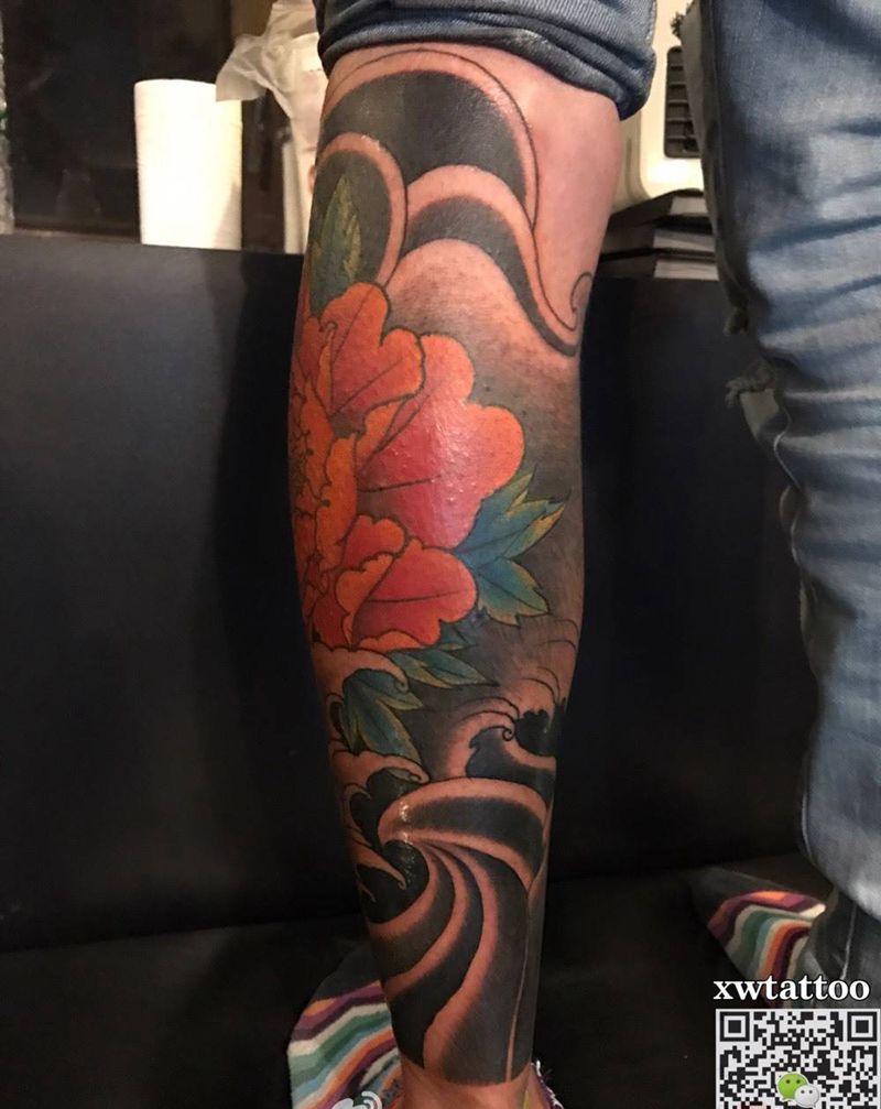 原创 传统 牡丹 水浪纹身图片_原创牡丹花水浪传统成品脚部纹身图案