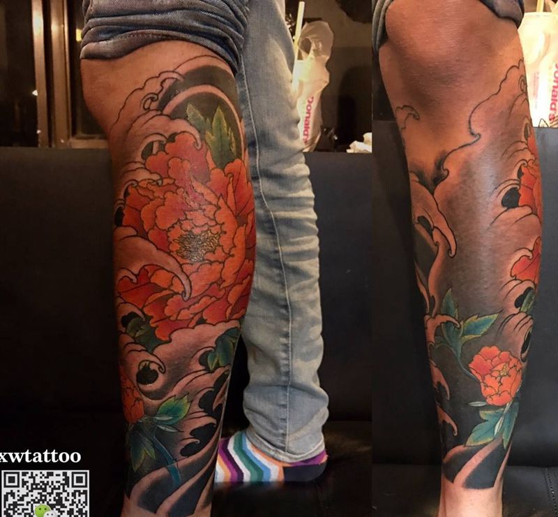 原创 传统 牡丹 水浪纹身图片_原创牡丹花水浪传统成品脚部纹身图案