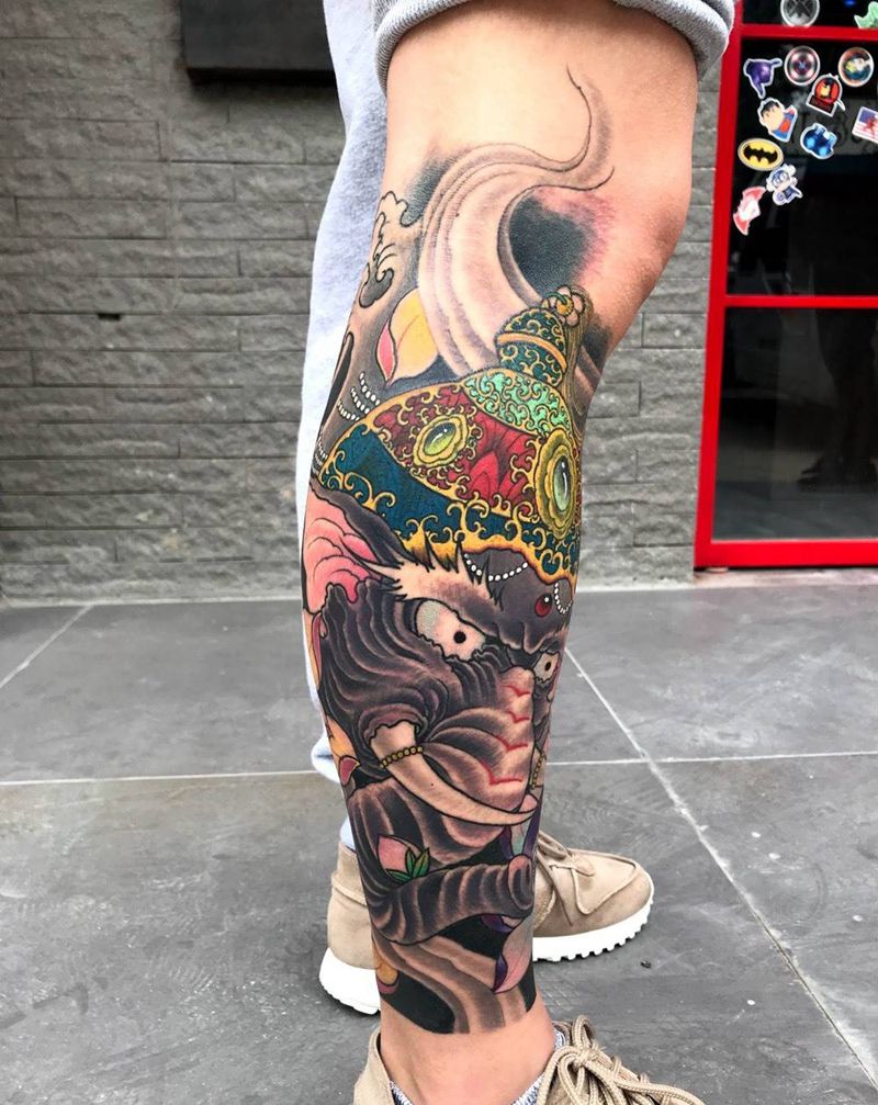 当前位置: 首页 >广东省广州市纹身店-栖宿刺青纹身图案>象神纹身图片_传统象神包小腿纹身图案