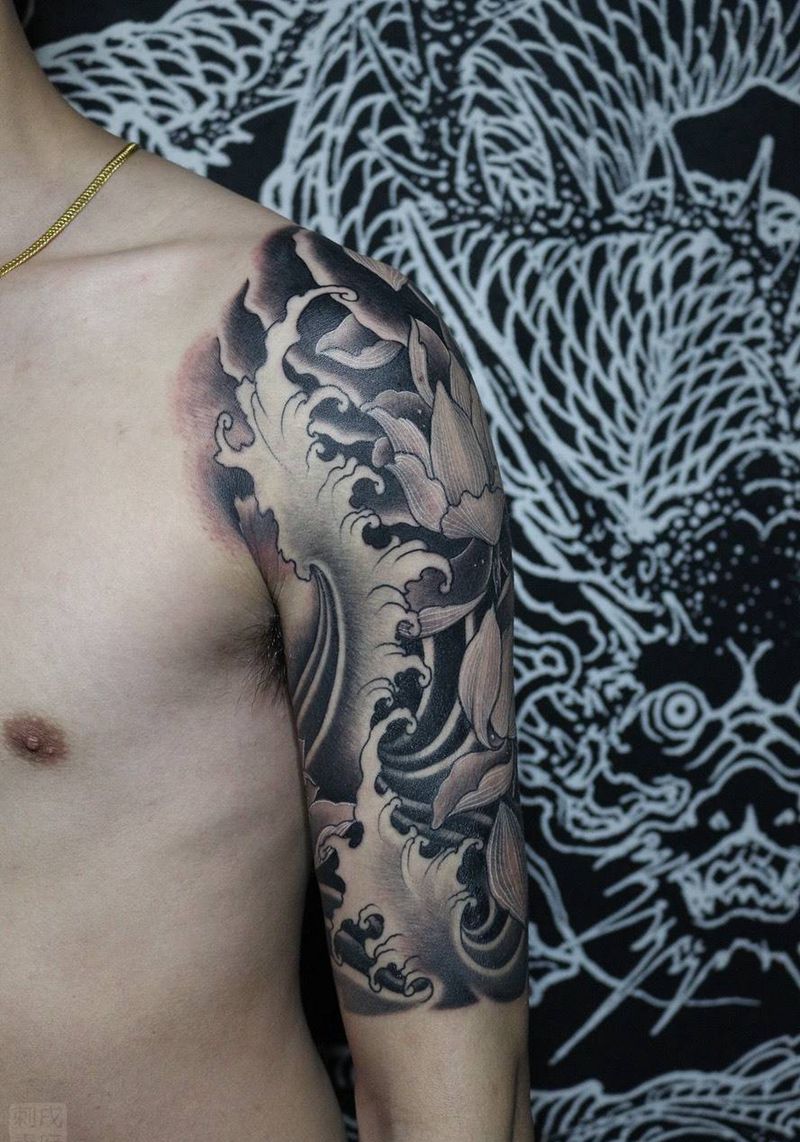 黑灰淡雅莲花纹身图片_手臂手部老传统新传统纹身图案