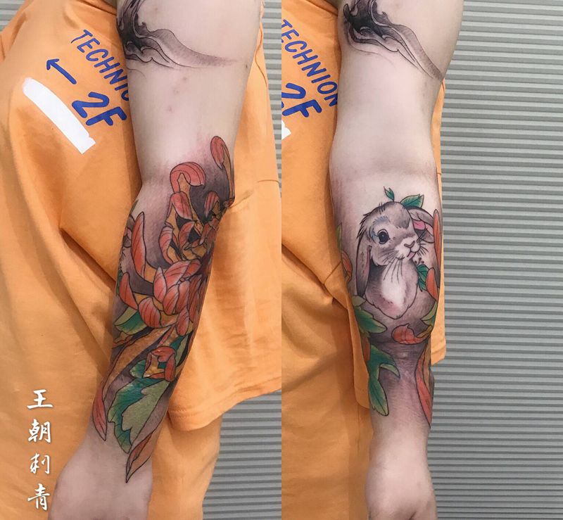 菊花纹身图片_手臂手部新传统菊花兔子纹身图案