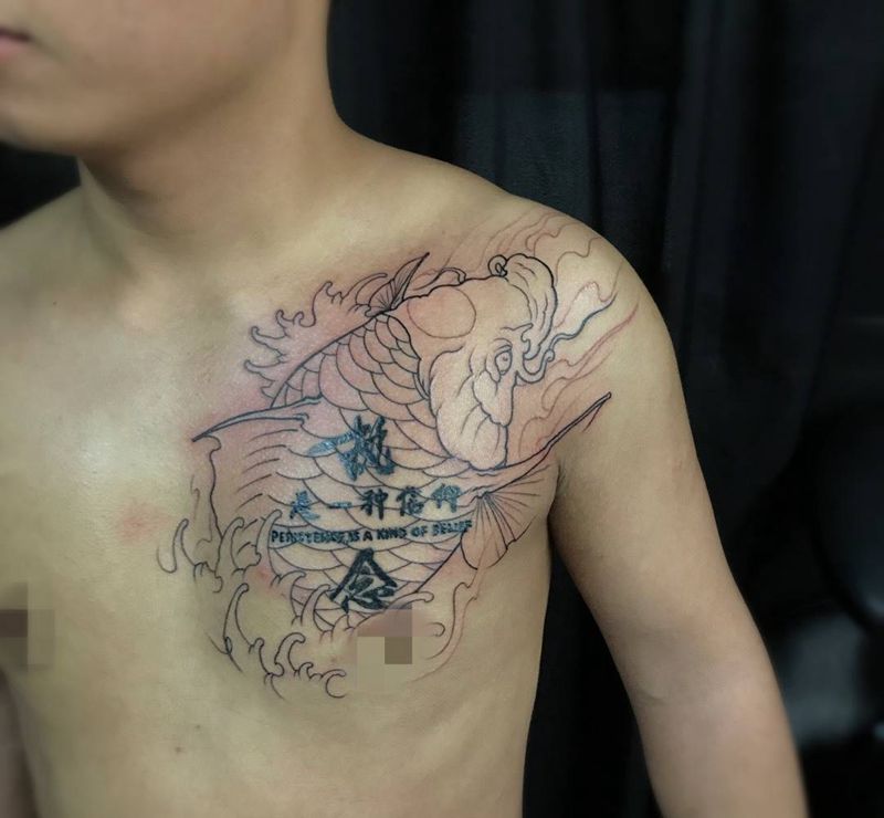 当前位置: 首页 >广东省广州市纹身店-广州王朝刺青纹身图案>鲤鱼遮盖纹身纹身图片_成品胸部传统动物原创遮盖鱼鲤鱼纹身图案
