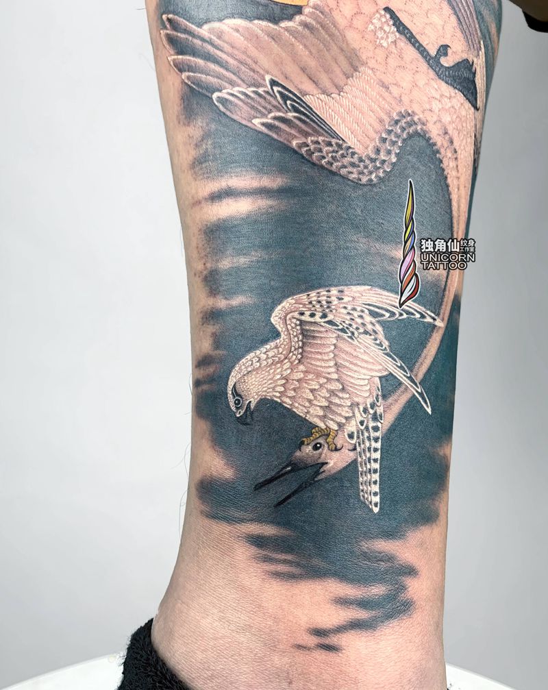 猎隼袭鸿鹄纹身图片_腿部新传统原创纹身图案