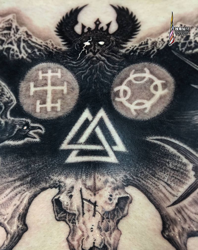 当前位置: 首页 >广东省广州市纹身店-广州独角仙纹身工作室纹身图案>北欧神话|花胸纹身图片_胸部欧美写实原创黑灰北欧神话纹身图案