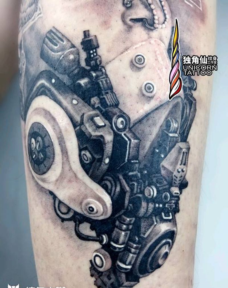 賽博•首-脑纹身图片_腿部欧美写实原创黑灰小腿纹身图案