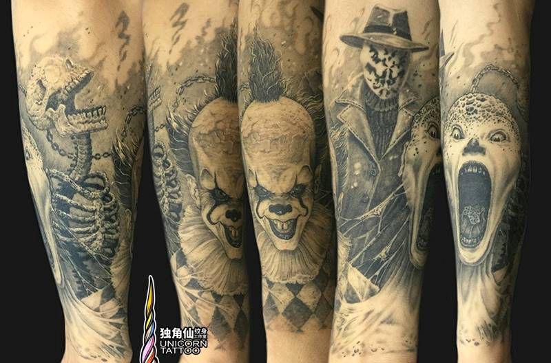 当前位置: 首页 >广东省广州市纹身店-广州独角仙纹身工作室纹身图案>惊悚主题花臂纹身图片_手臂欧美写实纹身图案