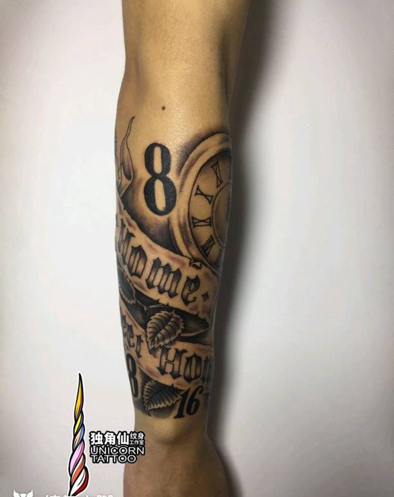 当前位置: 首页 >广东省广州市纹身店-广州独角仙纹身工作室纹身图案>美式小花臂纹身图片_手臂New School黑灰小臂纹身图案