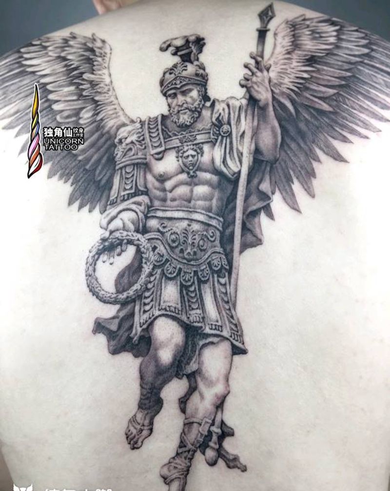 当前位置: 首页 >广东省广州市纹身店-广州独角仙纹身工作室纹身图案>罗马战神Mars纹身图片_背部欧美写实原创黑灰写实原创设计纹身图案