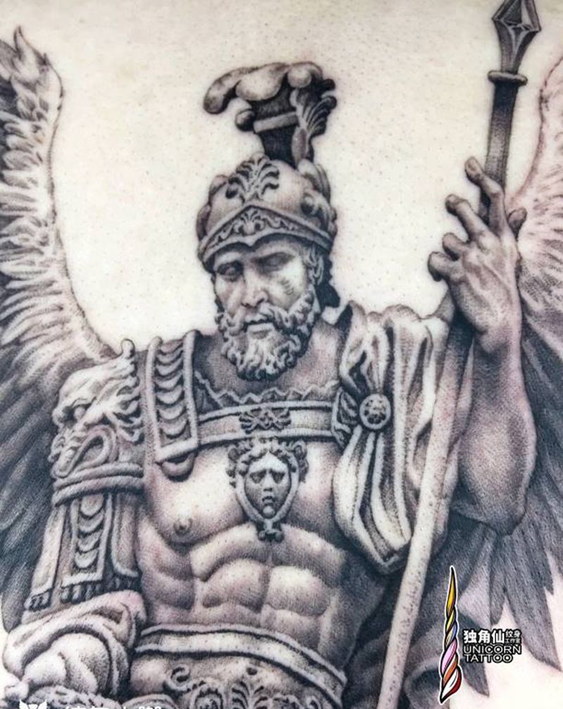 当前位置: 首页 >广东省广州市纹身店-广州独角仙纹身工作室纹身图案>罗马战神Mars纹身图片_背部欧美写实原创黑灰写实原创设计纹身图案