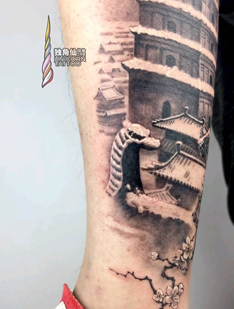 当前位置: 首页 >广东省广州市纹身店-广州独角仙纹身工作室纹身图案>大唐•长安纹身图片_腿部欧美写实水墨原创黑灰中国风纹身图案