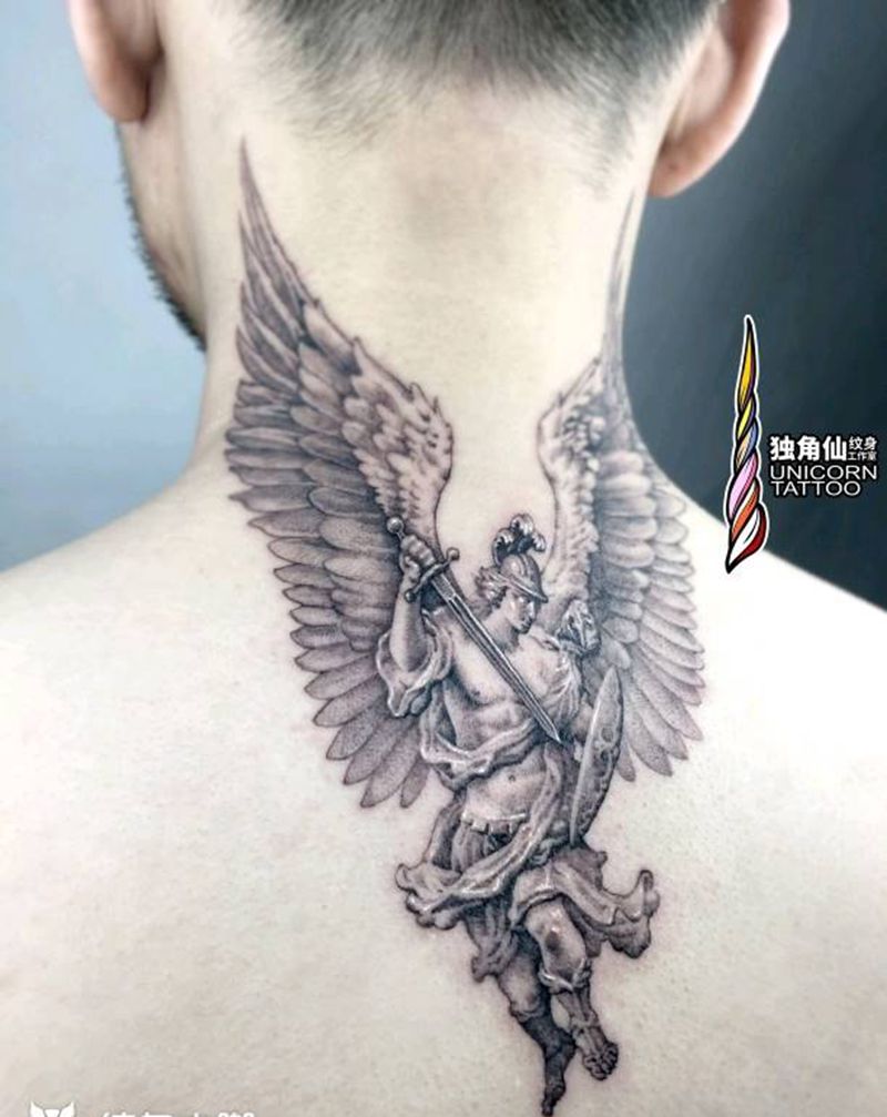 后颈天使纹身图片_颈部欧美写实原创黑灰写实原创设计纹身图案