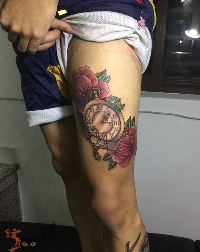 当前位置: 首页 >广东省广州市纹身店-肆海刺青纹身图案>时钟和花纹身图片_成品腿部欧美静物植物原创纹身图案