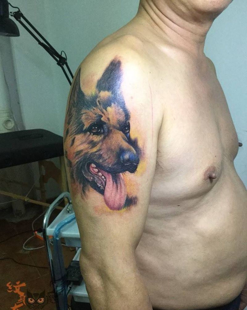 当前位置: 首页 >广东省广州市纹身店-肆海刺青纹身图案>德国黑背纹身图片_成品手臂写实动物纹身图案