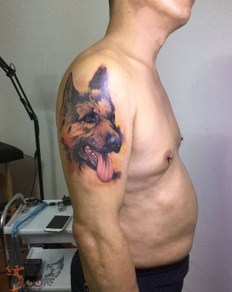 当前位置: 首页 >广东省广州市纹身店-肆海刺青纹身图案>德国黑背纹身图片_成品手臂写实动物纹身图案