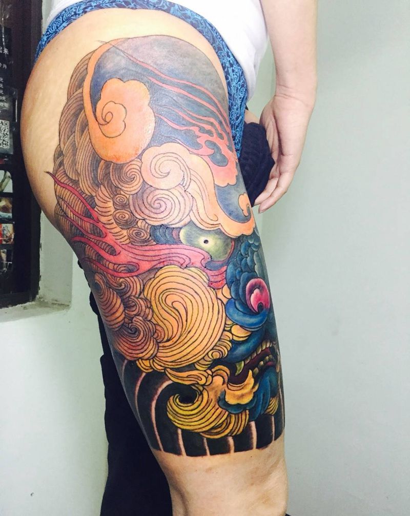 当前位置: 首页 >广东省广州市纹身店-肆海刺青纹身图案>包大腿唐狮纹身图片