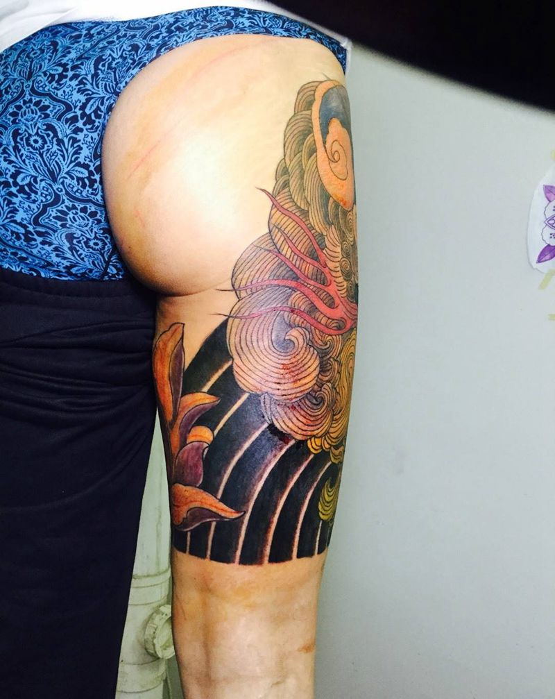 当前位置: 首页 >广东省广州市纹身店-肆海刺青纹身图案>包大腿唐狮纹身图片