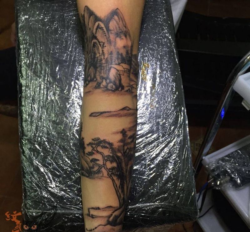 当前位置: 首页 >广东省广州市纹身店-肆海刺青纹身图案>山水画纹身图片_成品手臂国画原创植物静物纹身图案